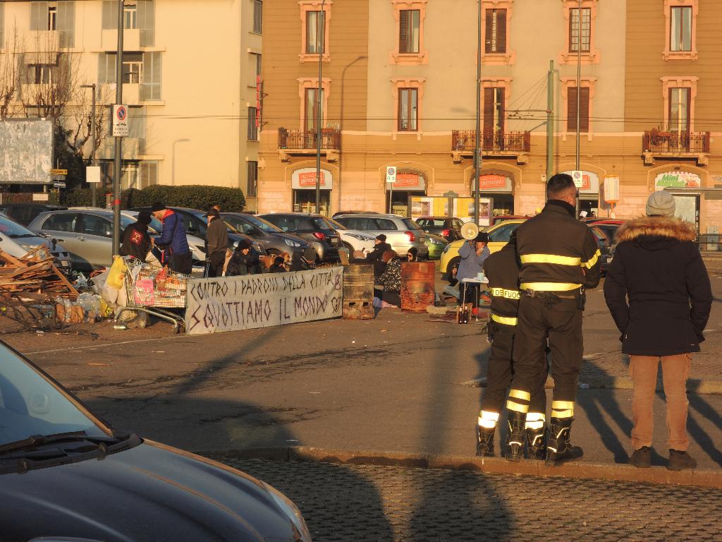 I due anarchici sono ancora lì, sul tetto della palazzina di Piazza Alfieri, e lì si preparano a trascorrere la terza notte. Sette metri più in basso, sul piazzale della stazione Bovisa, lo scenario è ancora lo stesso del 21 gennaio, giorno in cui è iniziato lo sgombero del centro sociale “Casa Brancaleone”: ci sono le forze dell’ordine, seppure in misura minore rispetto al primo giorno; ci sono i mezzi dei vigili del fuoco, pronti ad affrontare ogni eventuale emergenza; e ci sono i compagni dei due “irriducibili”, che non hanno mai smesso di presidiare la piazza. Sono una decina, hanno un banchetto con i volantini, affidano al megafono le loro rivendicazioni e le invettive contro i dirimpettai in divisa. Si definiscono “un gruppo di persone, fluttuanti, viaggiatrici, festaiole, naufragate o sopravvissuti dell’esistenza del lavora-produci-crepa”. Annunciano iniziative di sostegno, da un aperitivo vegan a un concerto per la serata del 23. Negano, come è stato scritto, che ci sia stata una divergenza all’origine della diversa scelta di tutti gli altri occupanti di abbandonare la struttura. Dichiarano esplicitamente il fine di questa loro resistenza: far capire “a chi lo ordina che costa caro sgomberare Brancaleone” e in generale “chi vive o sopravvive occupando”. Insomma, resistere abbastanza da rendere sconsigliabile in futuro la scelta dello sgombero. L’equipaggiamento e la determinazione dei due sul tetto, a quanto pare, sono sufficienti a far protrarre ancora questo braccio di ferro con le istituzioni.